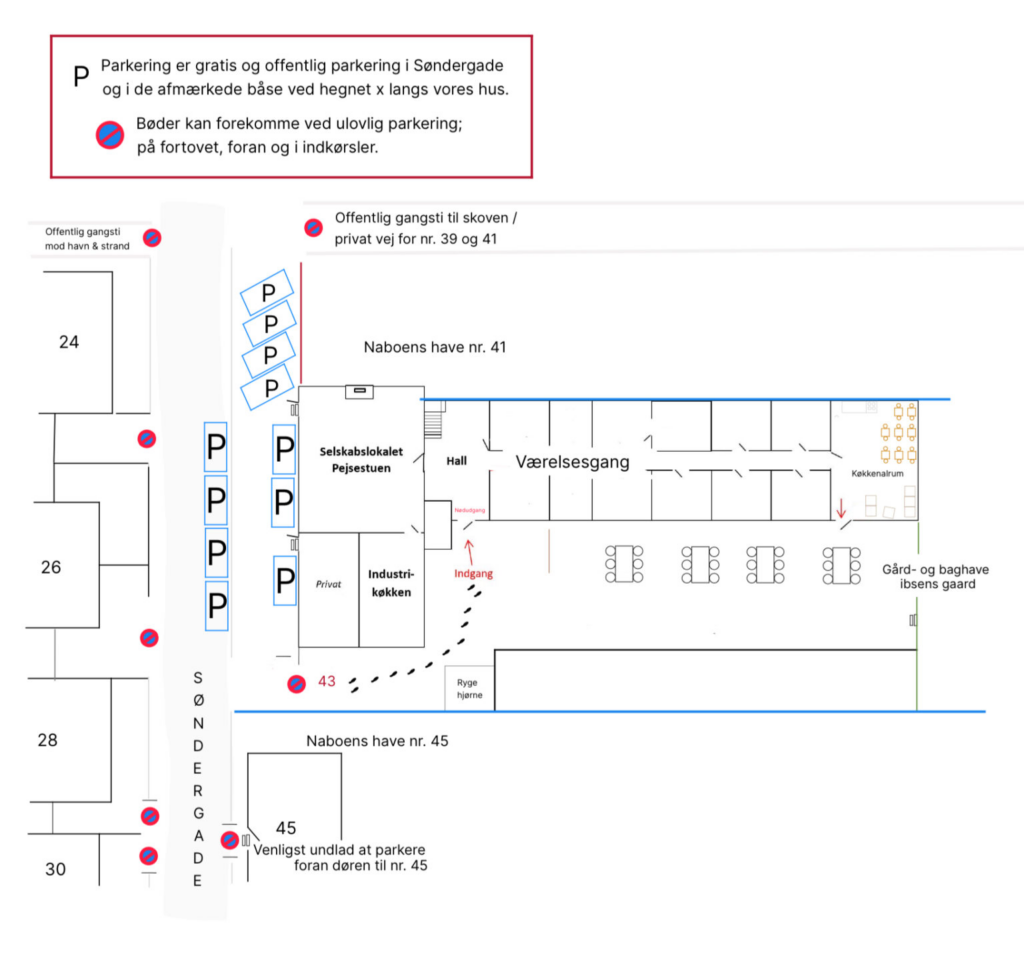 - Parkering er tilladt i gaden, husk at give plads til dem der parkere langs huset og undlad at blokere ind- og udkørsler.